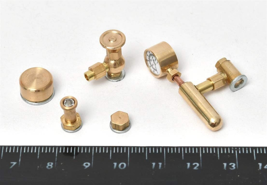 Here are the twiddly bits... made from brass rod, brass tube and 4mm hex bar. I was particularly pleased with the pressure gauge; it's glazed with the window from a spare porthole!