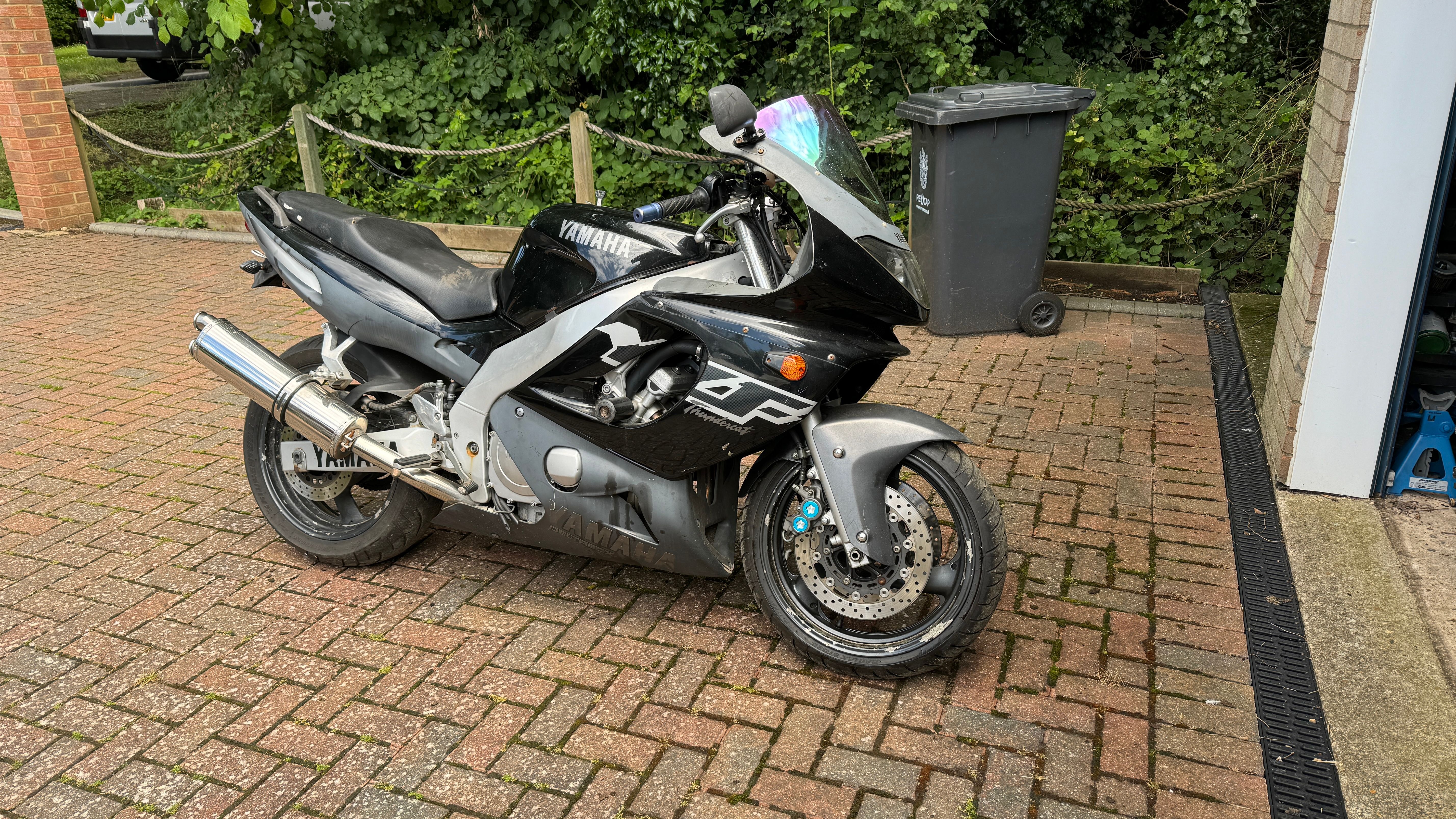 Donor YZF. This had been sat for about 5 years after being stolen/recovered, 30k miles but the guy who's doing the work stripped it and says it's mechanically sound, so in it went. I did ride it and get it ready for MOT, but it failed on fork seals, rear suspension and about a million other things.