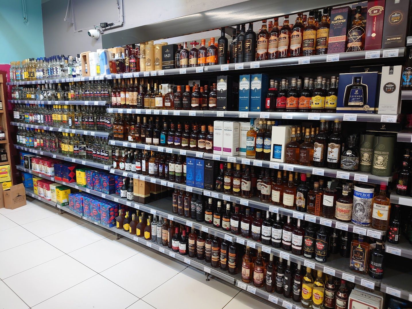 Rhum aisle at a standard Carrefour with 4 litre casks of 50%+ white rum in the bottom left.