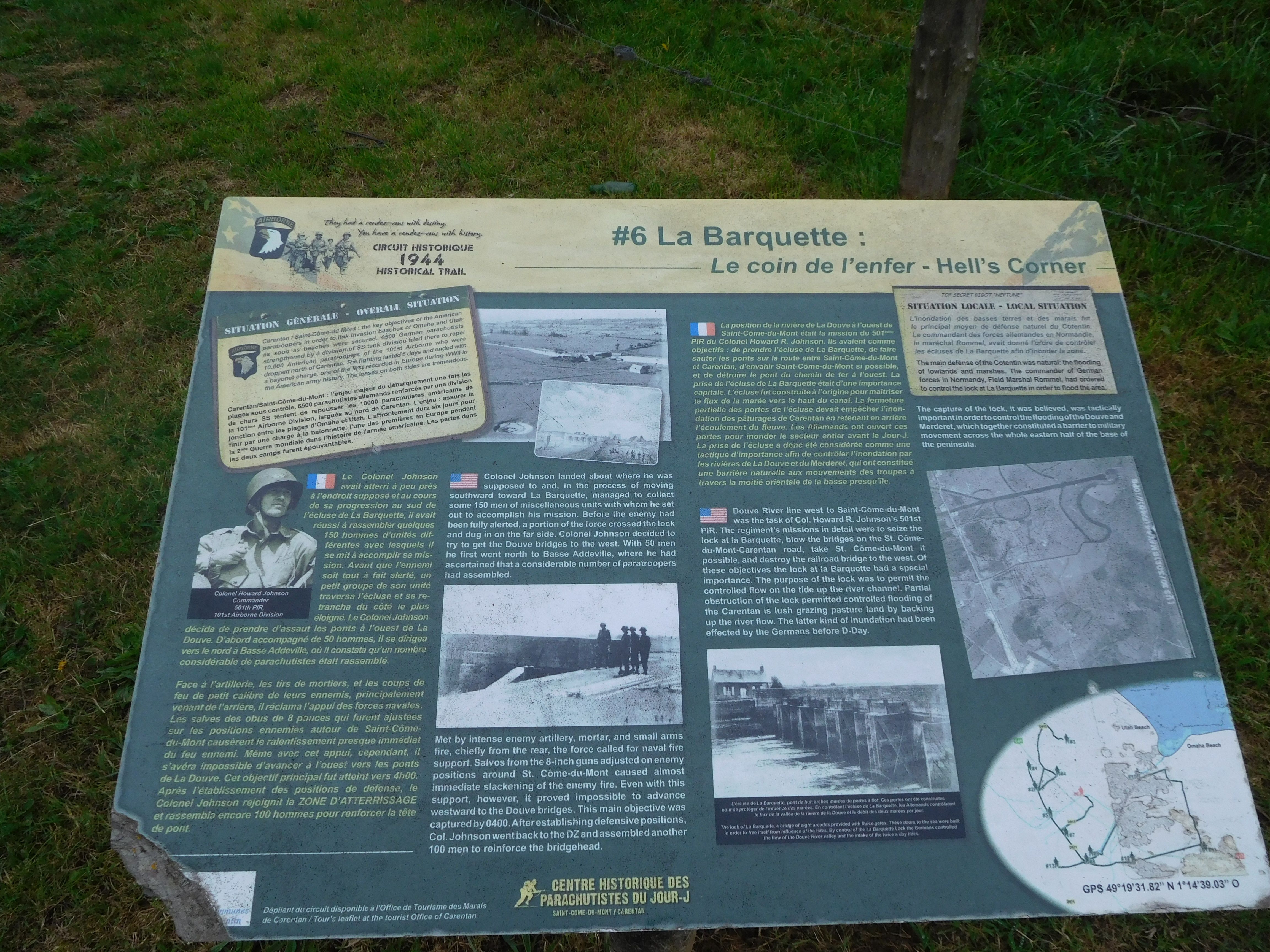Opposite the main gate is a small plaque explaining that this was the site of a temporary airfield established very soon after D-Day. I could find no physical evidence of the airfield - I suspect it was just grass fields and tents. I had given no thought to where we based aircraft after the landings so it was an eye opener for me.