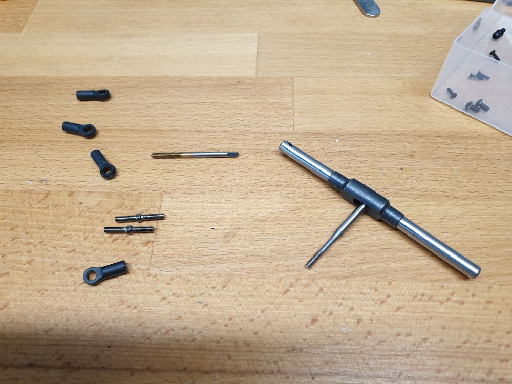 Steering turnbuckles - I tap both ends, Tamiya (in the wrench) for the standard thread, an eBay special (the gold-coated one) for the reverse thread. This makes them both stronger and easier to assemble than trying to drive the turnbuckle straight into the plastic. I tapped everywhere I could on this build.