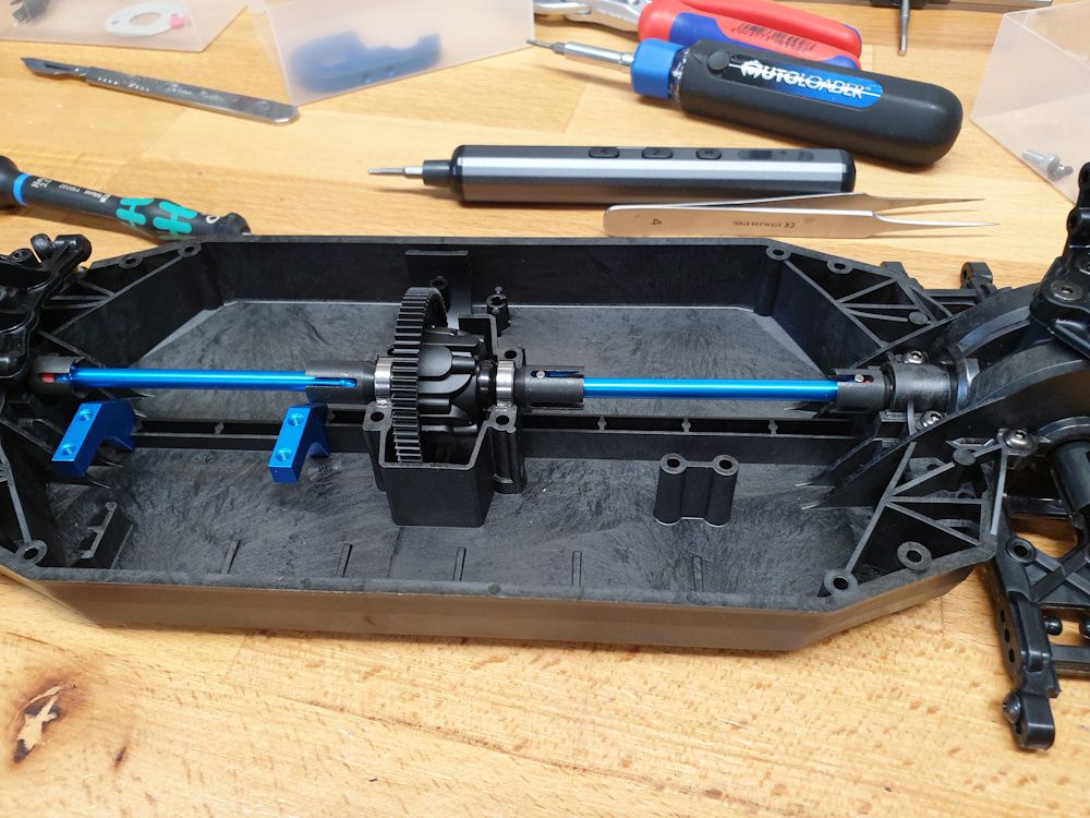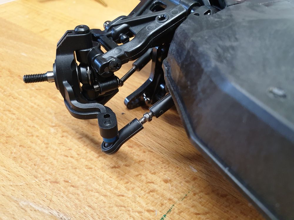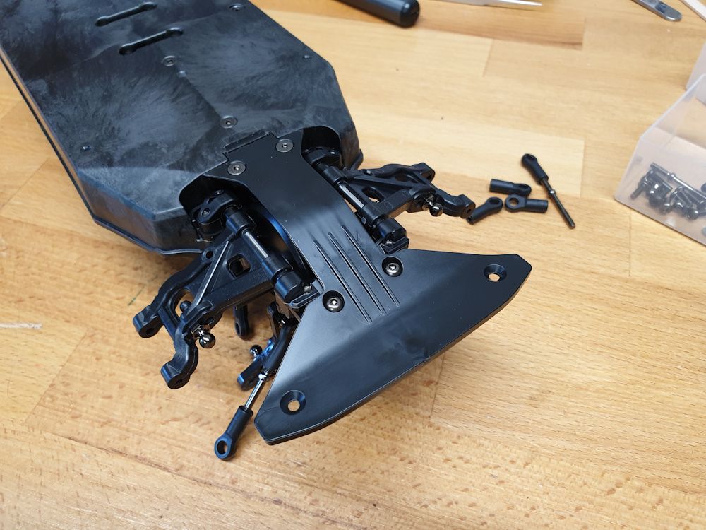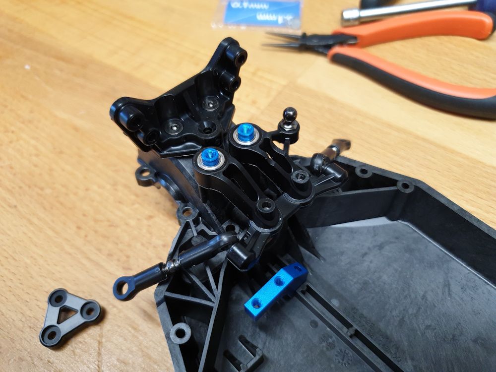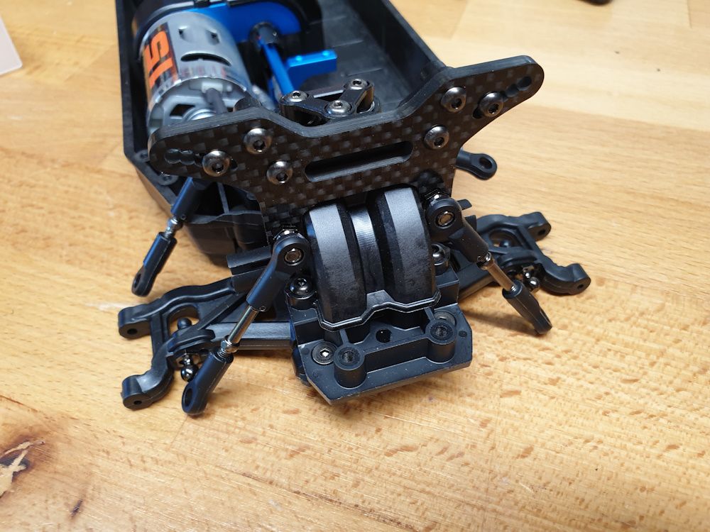 But begins with assembling the front arms to the lower part of the front diff housing. Teeny bit of wiggle in the arms so I added shims left over from the diffs - 0.1mm each side was just enough.
