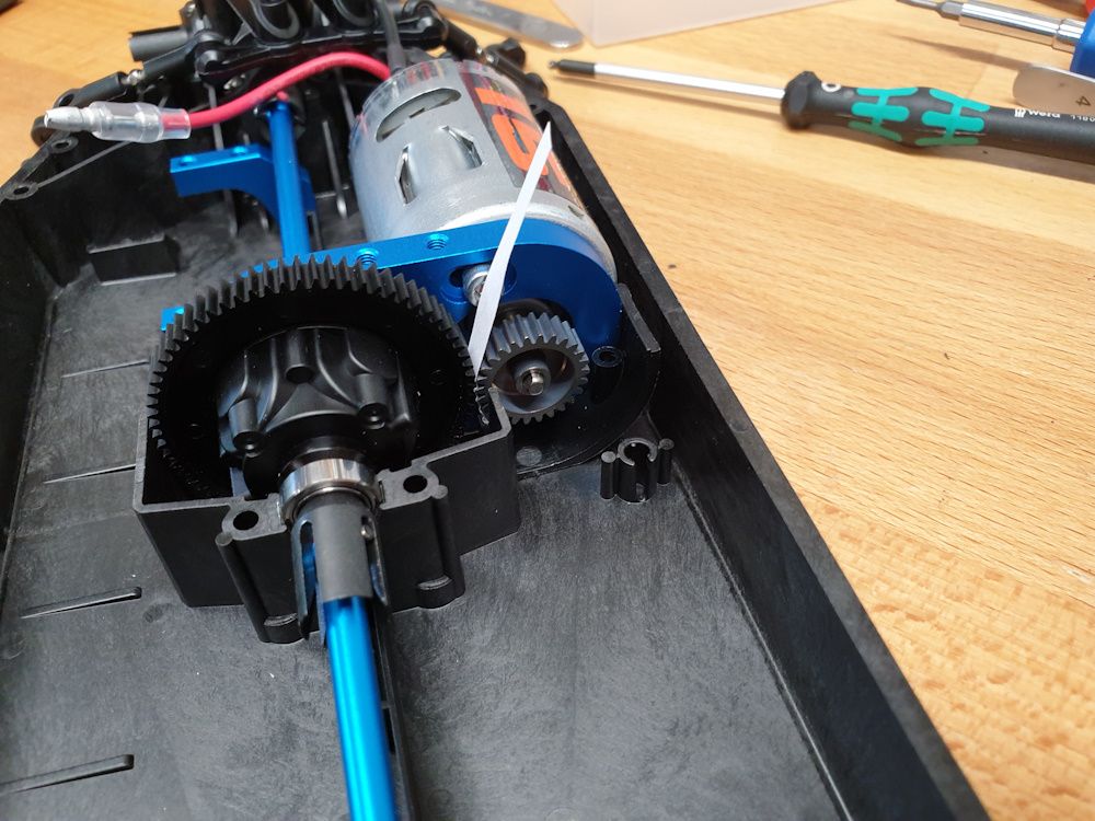 Motor goes in - a fairly modest brushed setup, though these Core RC motors seem fairly punchy. I set the gear mesh with a little bit of paper, because I read that's how to do it, and it seems to work. This is slightly awkward as you can't get to one of the motor screws with it installed, but you can tighten the other one right up, remove the mount, and then tighten the other, and that works OK.