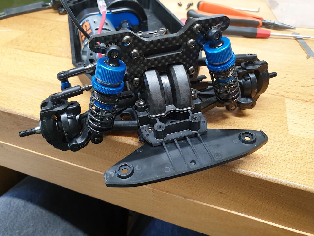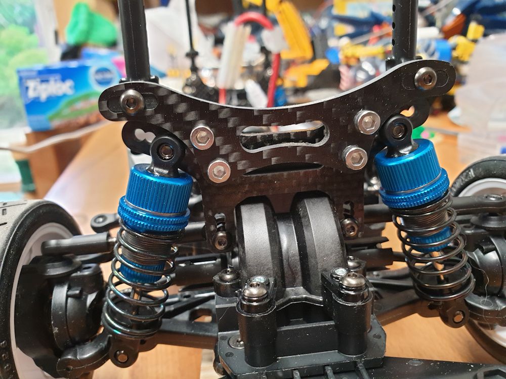 However, with a bit of ingenuity, and some spare spacers from one of the sprues, you can move the rear body mount back to where it'd be on a TT02 chassis. The front is a bit tricker; I ended up designing an fitting a little carbon fibre bracket that takes another set of rear body mounts and positions them where they'd be on a TT02.