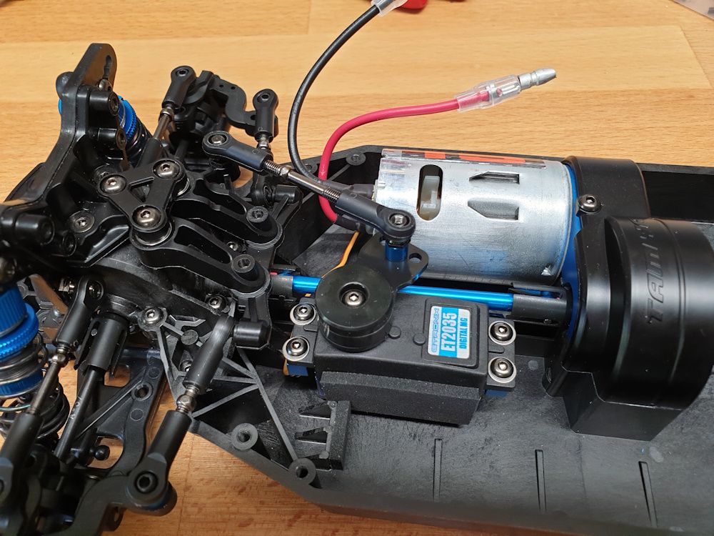 On go the wheels (with foams), and the body mounts, which are in completely the wrong place for literally every body Tamiya has ever made.