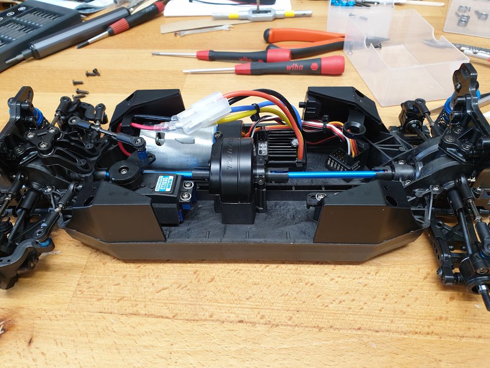 First stage. The tub is composite - I think glass reinforced. Aluminium servo mounts and steering mounts go in, with some wood glue to act as threadlock, because wood glue won't attack the plastic like normal threadlock does.