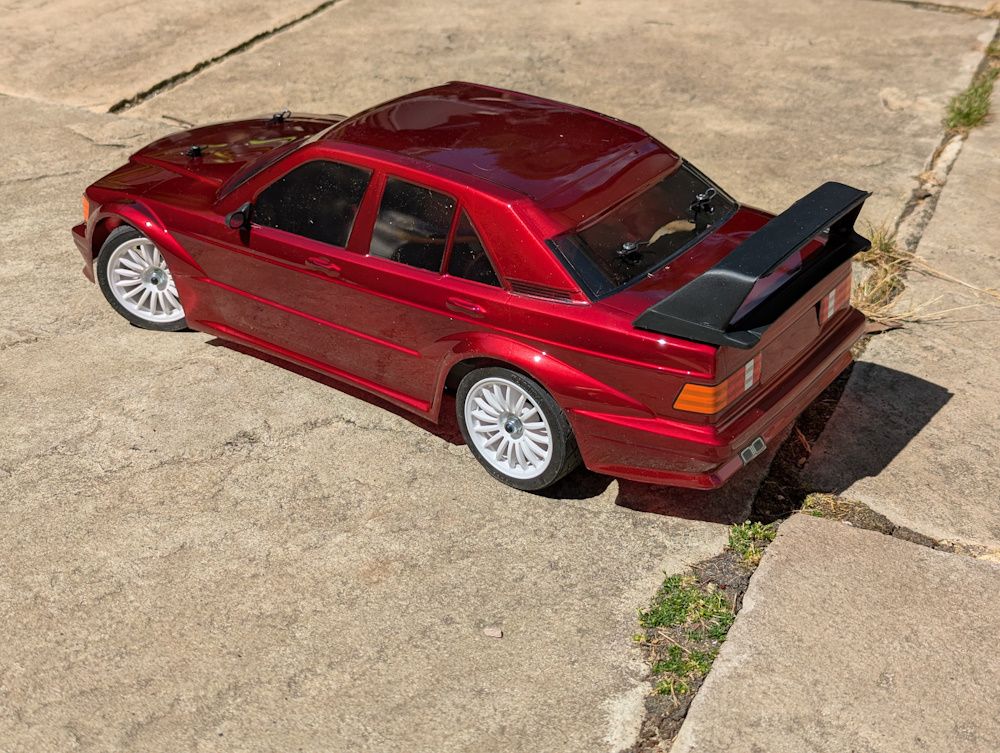 At this stage let's skip the bit where I try a Volvo 850 body but discover that when you cut it out the sides splay out by about 4cm, making it completely unusable. Instead I quite like the look of the Tamiya Mercedes 190E body, but it only comes with pre-cut mounting holes in TT01/TT02 positions.