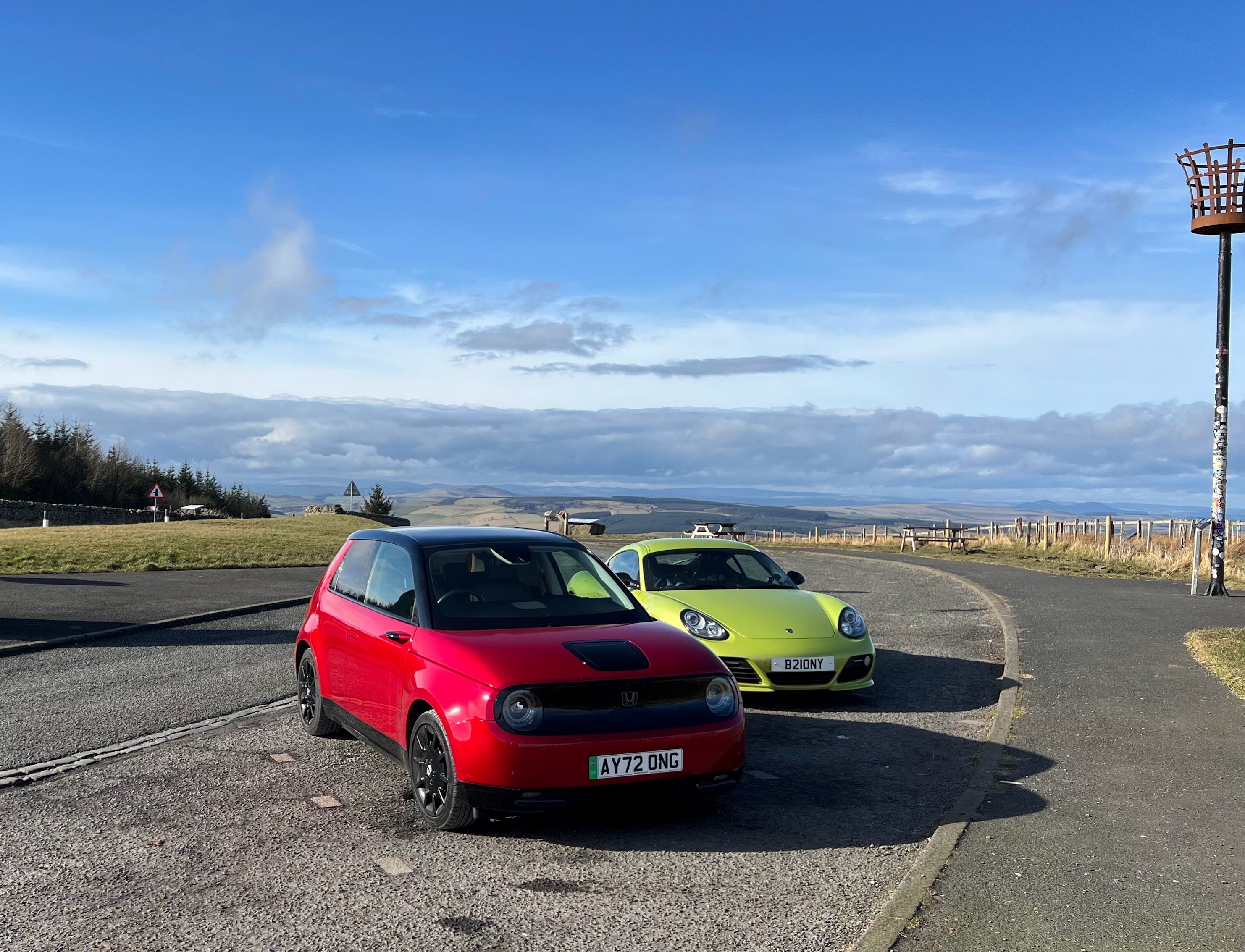 Back in February it took 9 hours, 265 miles and 4 charging stops to collect this rare E! One epic drive to bring this car home from Edinburgh to Stoke 🏴󠁧󠁢󠁳󠁣󠁴󠁿 We also took my Cayman R and went the scenic route to enjoy the journey on lots of twisty A & B roads. Although it's probably going to be the furthest I'll ever go it was surprisingly pleasant and enjoyable to drive on such a long journey. Averaged around 3.6 miles per KWH & 1% seemed to equal around 1 mile so it was easy to plan stops. It's my first EV so struggled a little with some of the chargers but made sure there was plenty to do nearby. We made a YouTube video if anyone is interested: https://youtu.be/4uQ0a1oVn58?si=I5kzv0avMihdfh2p