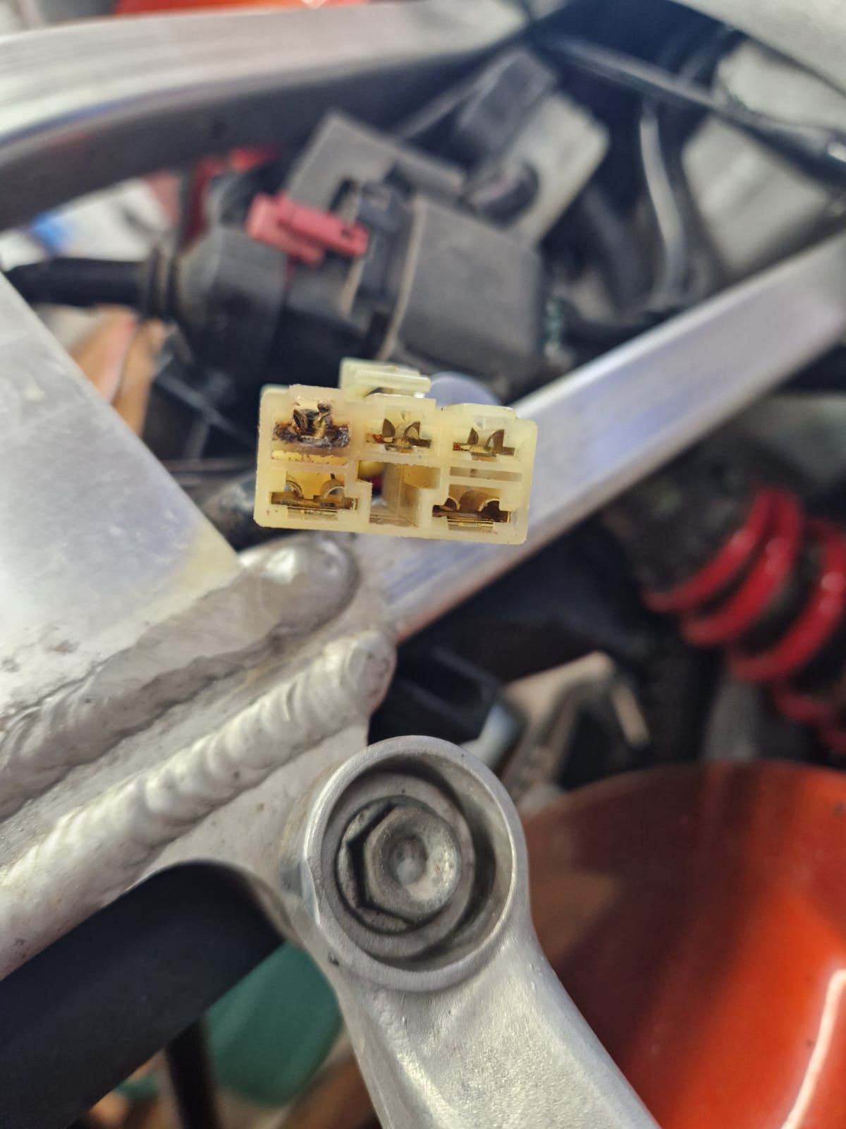 On my bike the top three wires all come from the stator. So the top connector on the left has got very hot at some point, and it did not look like that a few weeks ago.
