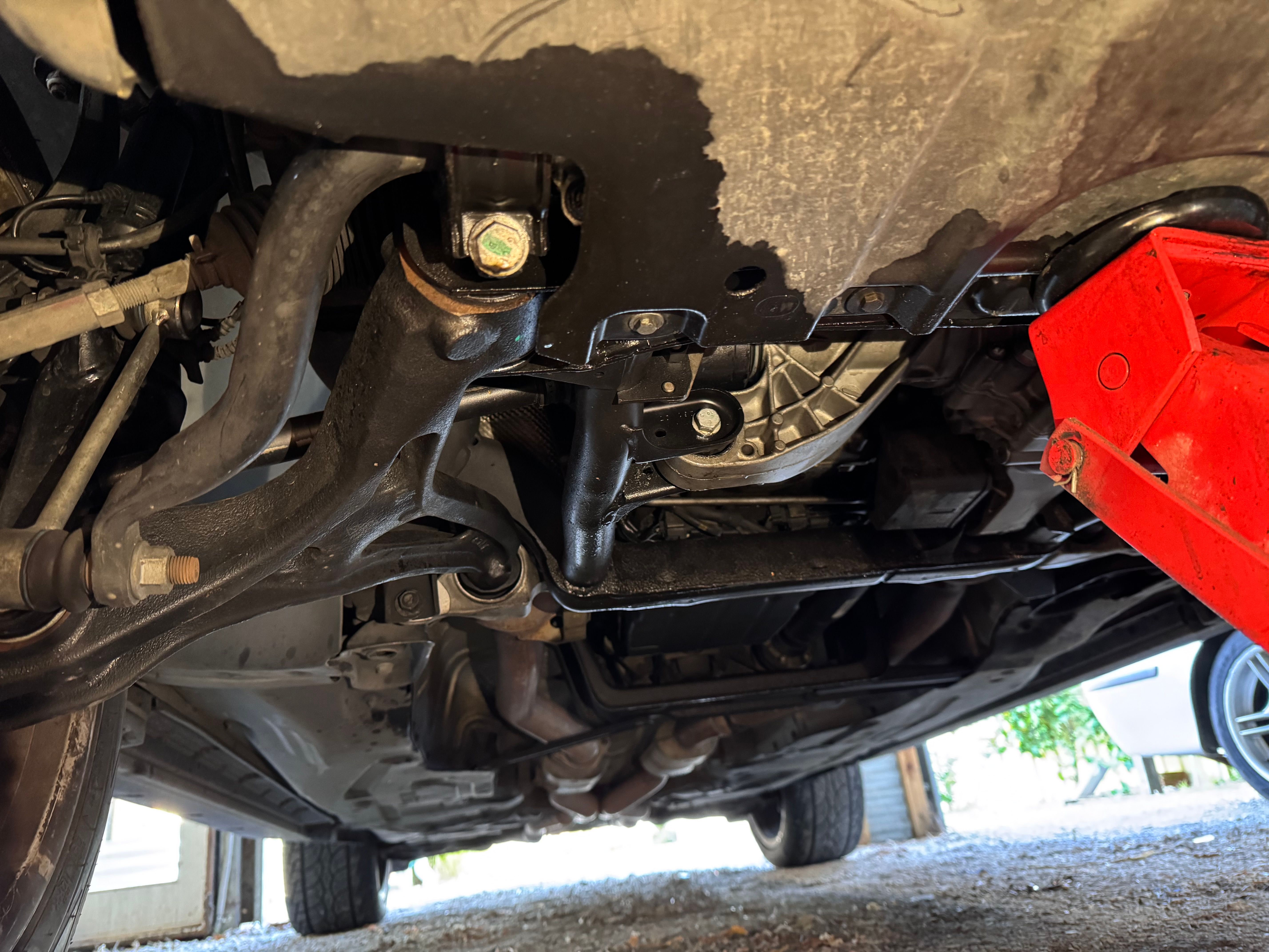 Quick survey of the underside, oil leak. Looks like engine oil. The M156 is known for leaks and the previous owner just had the cam cover gaskets replaced. I'll clean it all up and see what's what, one thing Australian testers hate is oil leaks!