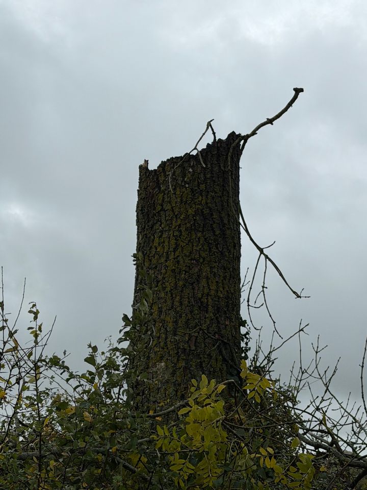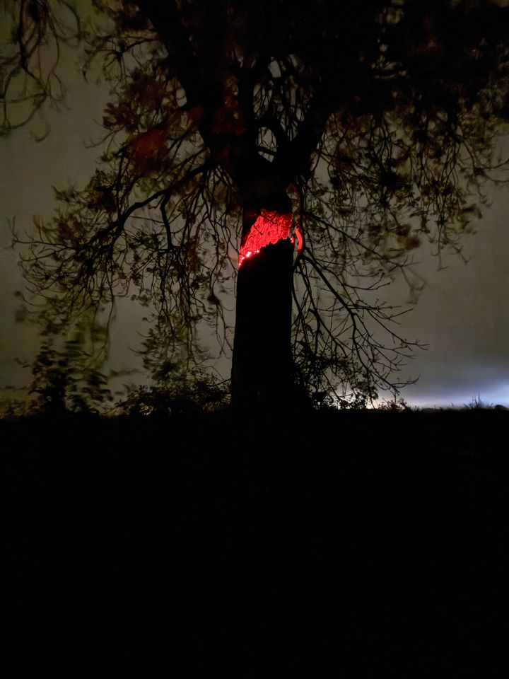 Came round the corner on the lane and saw a faint diagonal orange line in the distance, some way above the road surface. As I got nearer, realised it was a tree on fire