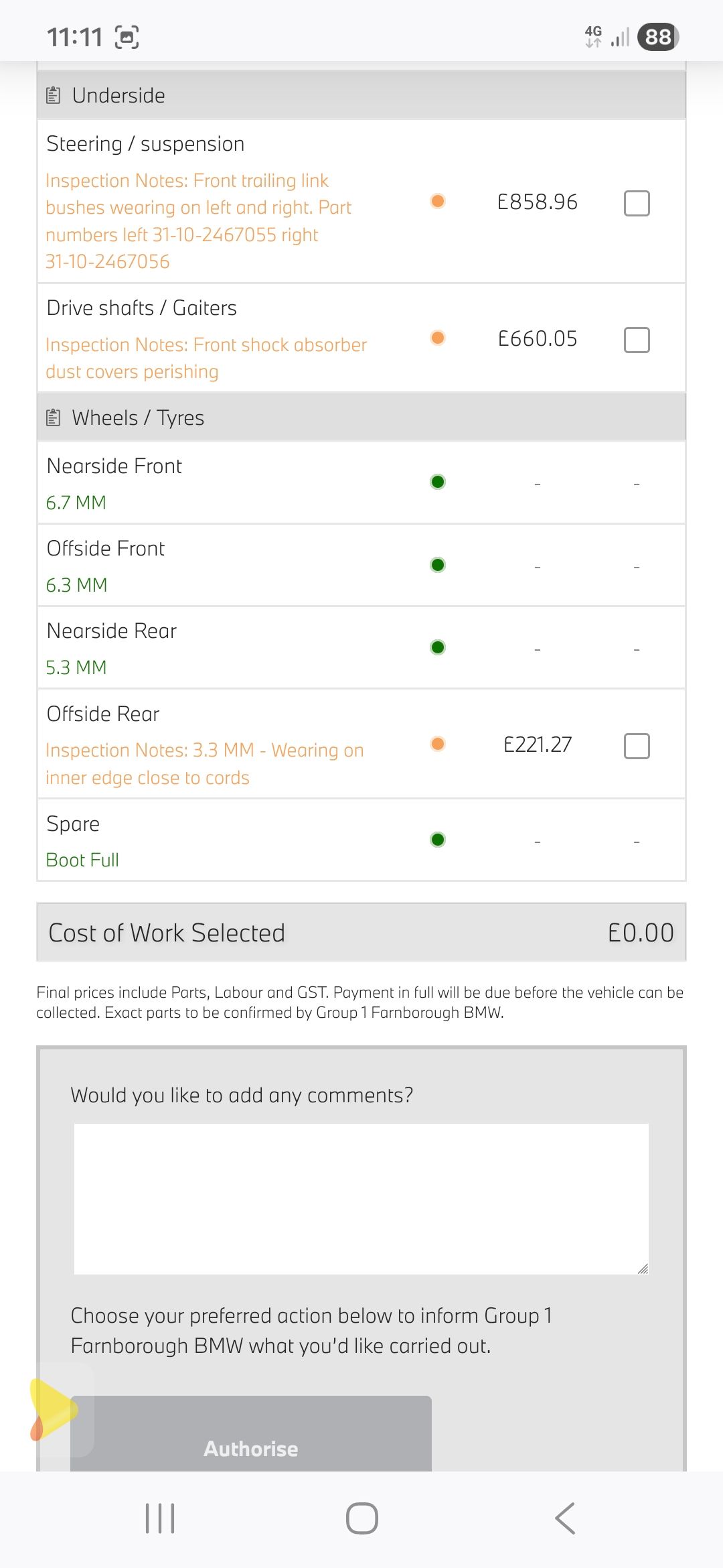 Got an email about 5 hours later asking which other parts I wanted doing - and if I'd just said "do it" I'd have been £5k down for work that they said was urgent, but suddenly disappeared when I told them it was under AUC warranty and less than 3 months into my ownership.