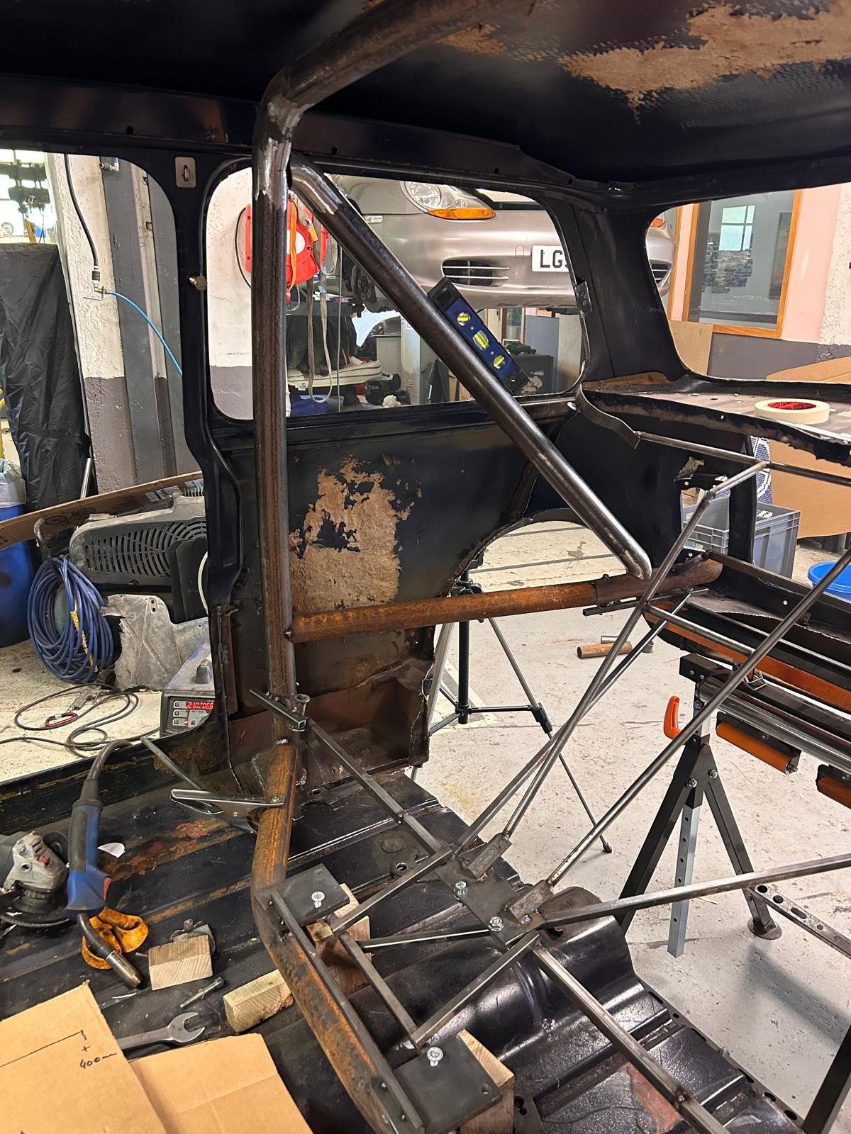 First thing I needed to do was to strip out the MINI and cut away all the rear seat and so on. After this, it was a case of starting to disassemble also the Porsche, removing the engine and all the suspension and gearbox, etc. After this, I built a jig out of steel framework to keep all the main mounting points on this jig, which I could then transfer into the MINI and build the rollbar and mounts from.