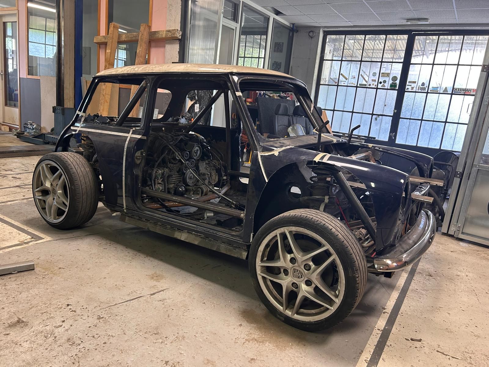 But last year I decided to build a fun track car. I had build a R1 powered mini back in 2001, but sold it here as I could register it and always regretted doing so. Having found a nice Innocenti mini shell, N.B. Innocenti built the mini under license in Italy, I looked on Copart UK, and won a auction for a Porsche Boxster 2.7 and then project PigMi started!