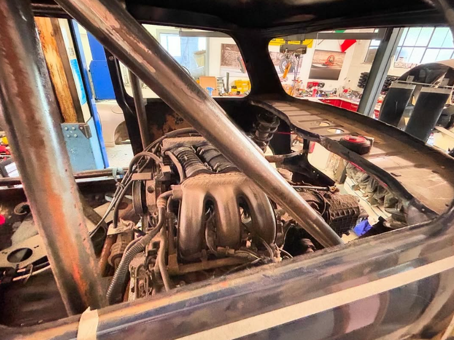 Once the base of the roll cage was built, I was able to mount the engine in, and also the front subframe, and this gave me pretty much a rolling shell. From there, I could then start building up the rest of the roll cage and reinforcements, and start moving the shell around the workshop.