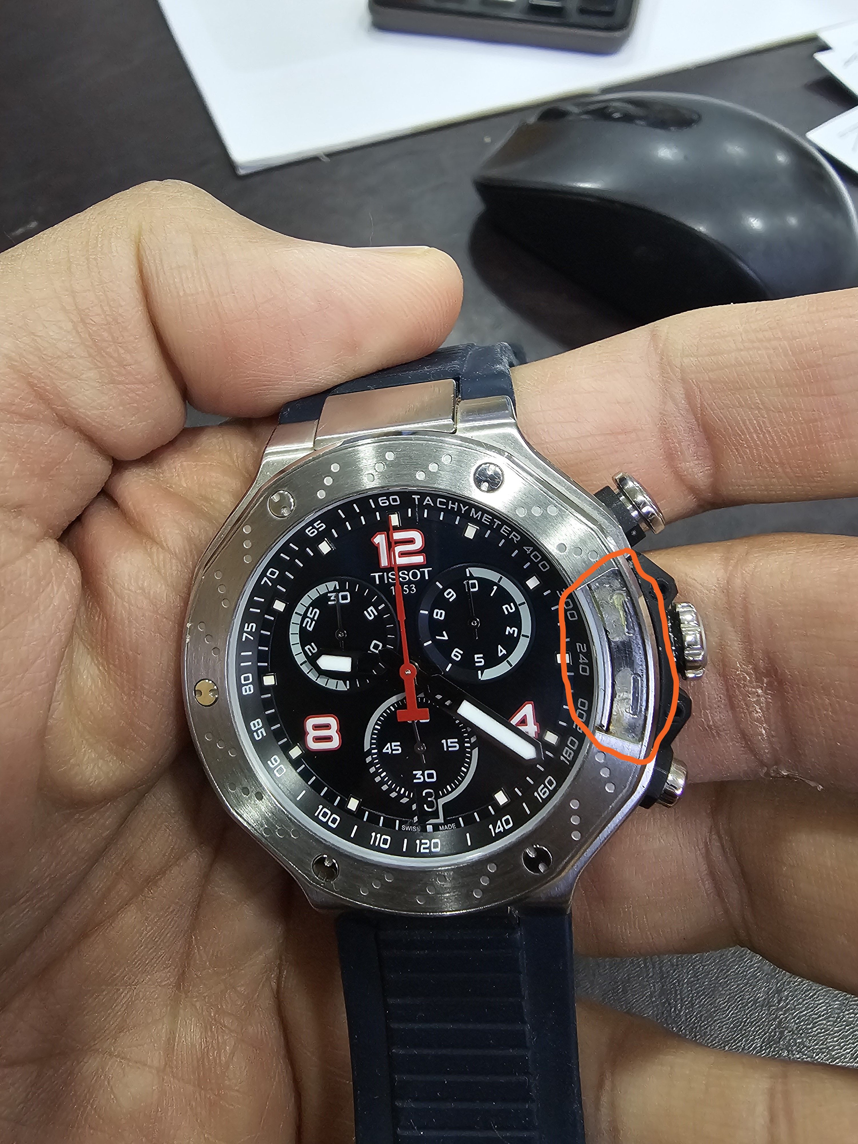Not sure of the back story, but a piece of the bezel at 3 o'clock has come off from the watch. Looks like it was glued in.
