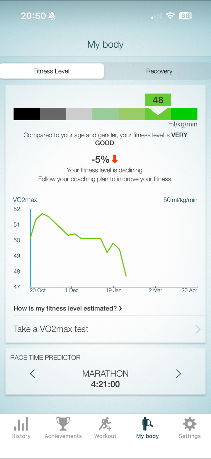 Do you think the Vo2 max calculation was right to start with? Or now? Or neither? Looking online, a 26 minute 5km suggest a vo2 max significantly below 50, so maybe December's calculation was/is still adjusting down? I will say I'm a cyclist not a runner, so I could be wrong.