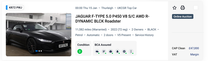 The rest are comedically cheap. As F-Types roll over 10 years old they're following every other Jaguar since the early 70s and going worthless, I watched a 90k FMDSH 2014 V8 S Roadster get 14k at BCA the other day which is a enormous, ENORMOUS drop from even a year ago. Times are tough for the sort of toy cars normal chaps have across the market though.