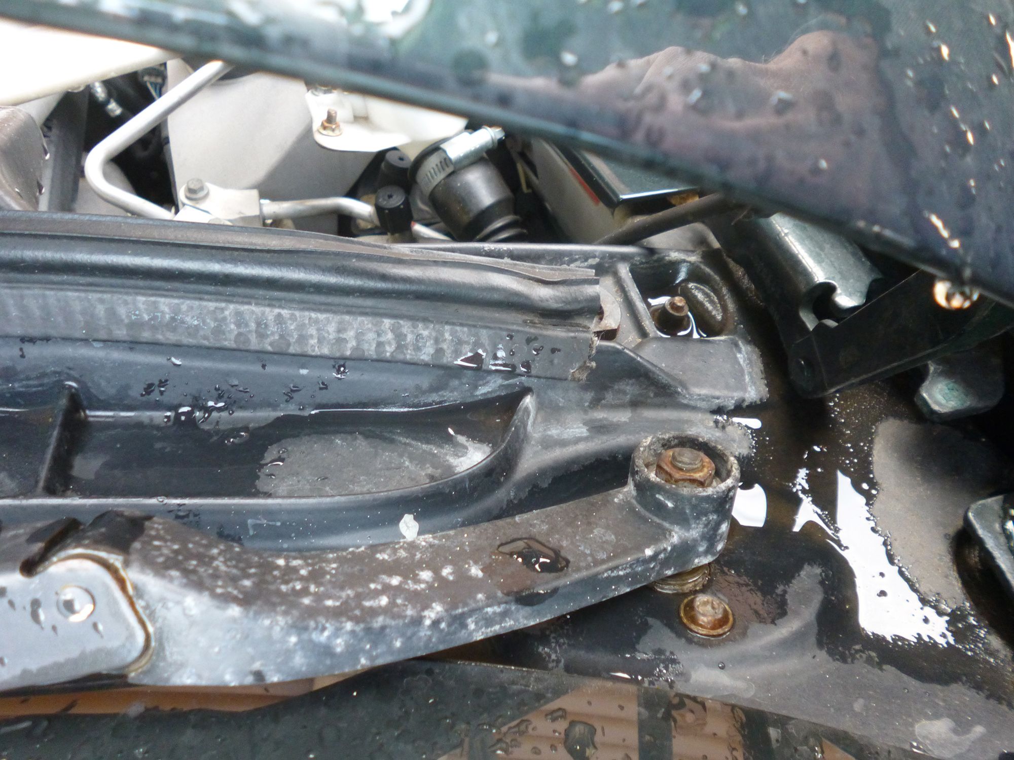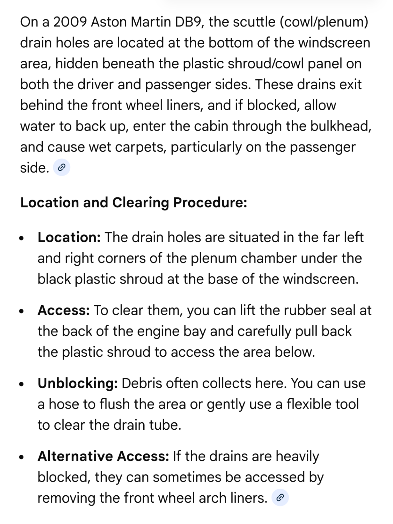 I'm grateful for your input but you seem to have a different model of Aston, as your problem was a blocked scuttle drain hole, the leak was in the passenger footwell and there being no drain hole on the driver's side. My leak is the driver's footwell.I had hoped to see a drain hole in the scuttle's offside with leaves stuck in it, but couldn't see one.
