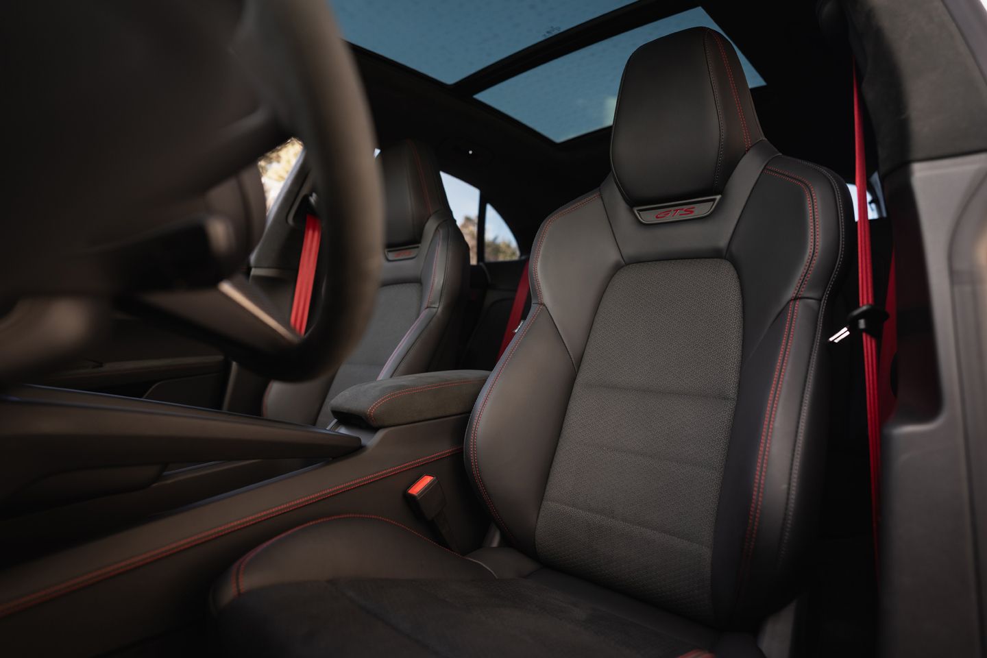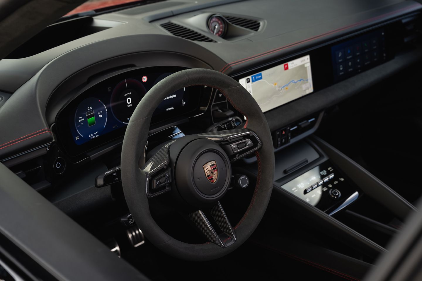 If the typical GTS hallmarks are a bit hit and miss on the outside, inside the appearance of fleecy Race-Tex on most surfaces you come into contact with - not least the always-welcome GT Sports steering wheel - works its familiar charm, as do the 18-way sports seats. More leather is deployed than in the cooking models, too, and while the Macan is no less preoccupied with touchscreens than any other high-end EV, they are at least nicely integrated into the dash and generally usable. You can even play video games on the optional passenger display if you wish, assuming you’re partial to very mild motion sickness.